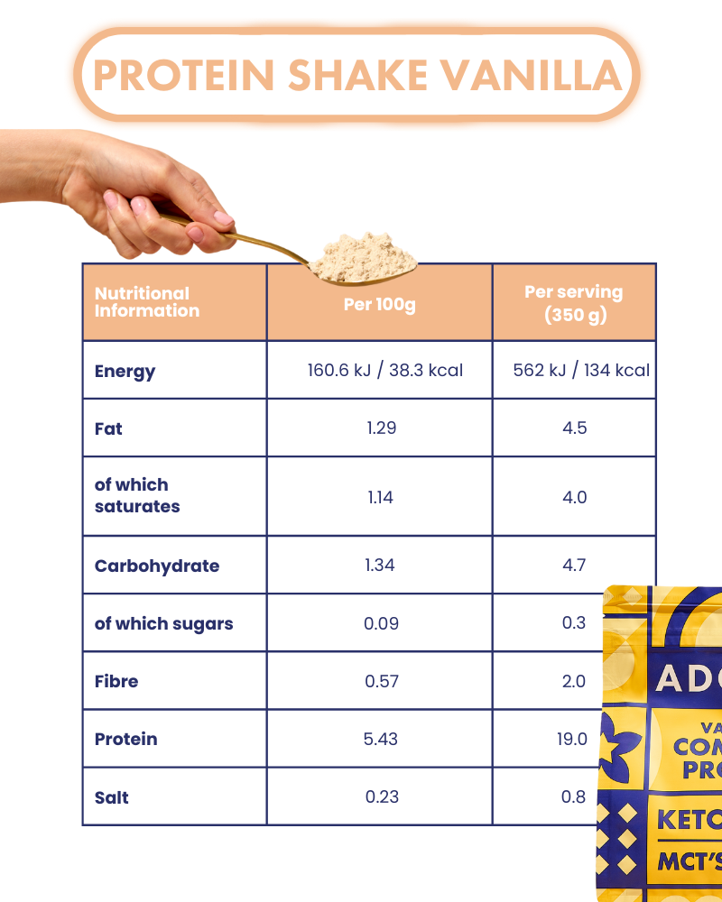 Your Keto-friendly Vanilla High-Protein Shake — 19g plant-based protein, only 0.3g sugar, enriched with MCT's and 17 vitamins & minerals.