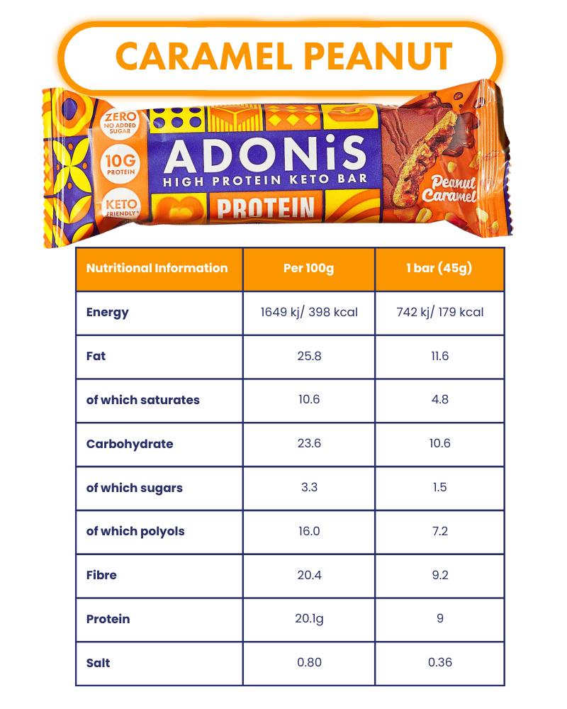 Your Keto-friendly Adonis Caramel Peanut Bar — 9.7g protein, only 4g net carbs, low sugar and that signature Adonis crunch.