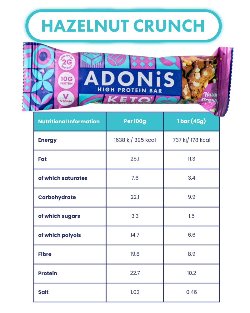 Your Keto-friendly Adonis Hazelnut Crunch Bar — 9.5g protein, only 3.4g net carbs, low sugar and that signature Adonis crunch.